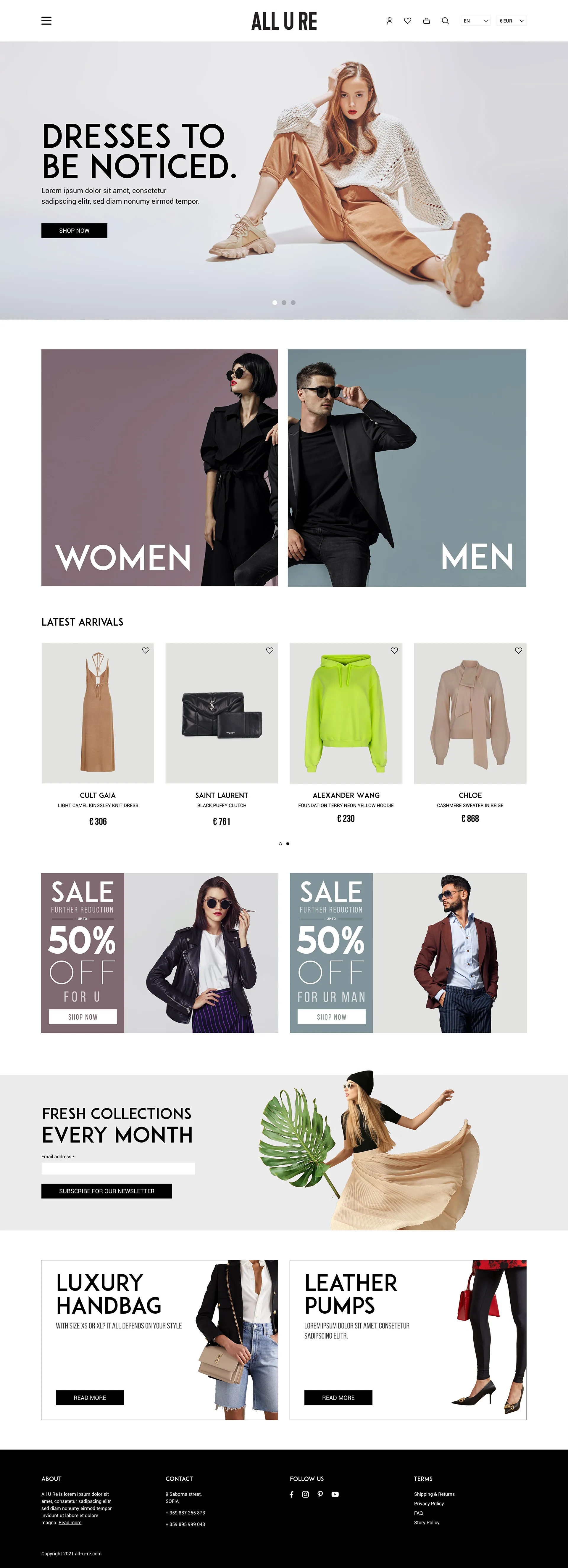 In 2022, ALL-U-RE approached the design agency where I was part of the creative team for a website redesign. The brand’s website offered premium fashion products but struggled to effectively communicate its high-end identity and provide a seamless user experience. The project was coordinated by a project manager, ensuring smooth client communication and a structured workflow.